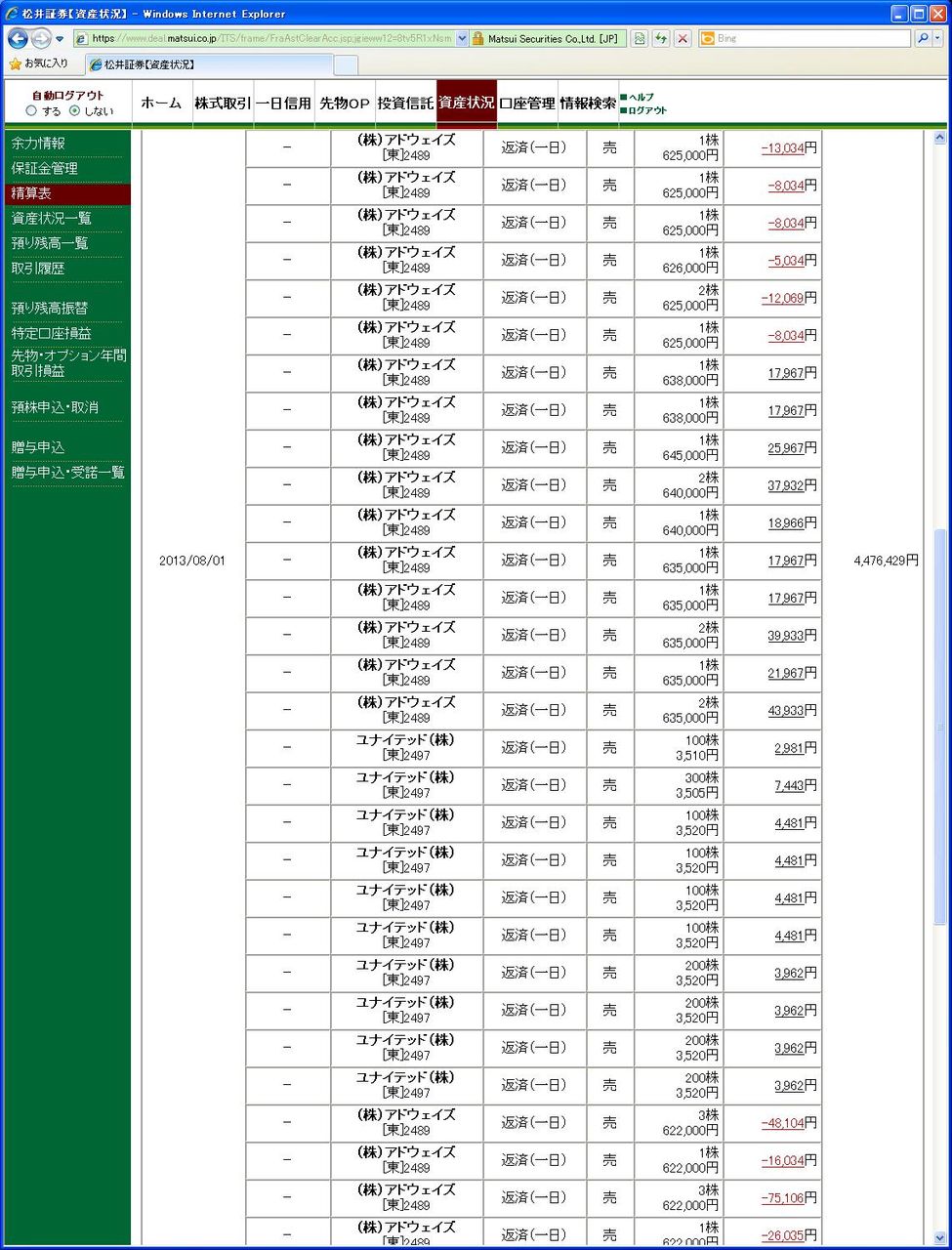 画像は本日の清算表の一部です。(本日分全取引の6分の1程度、口座残高の分かる部分をアップしています、日付は受け渡し日で入っています)