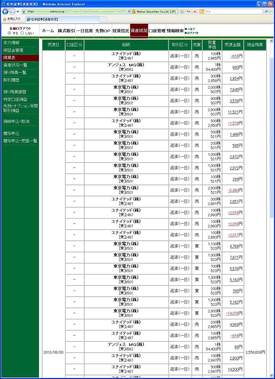 画像は松井証券、本日の清算表の一部です。(本日分全取引の2分の1程度、口座残高の分かる部分をアップしています、日付は受け渡し日で入っています)
