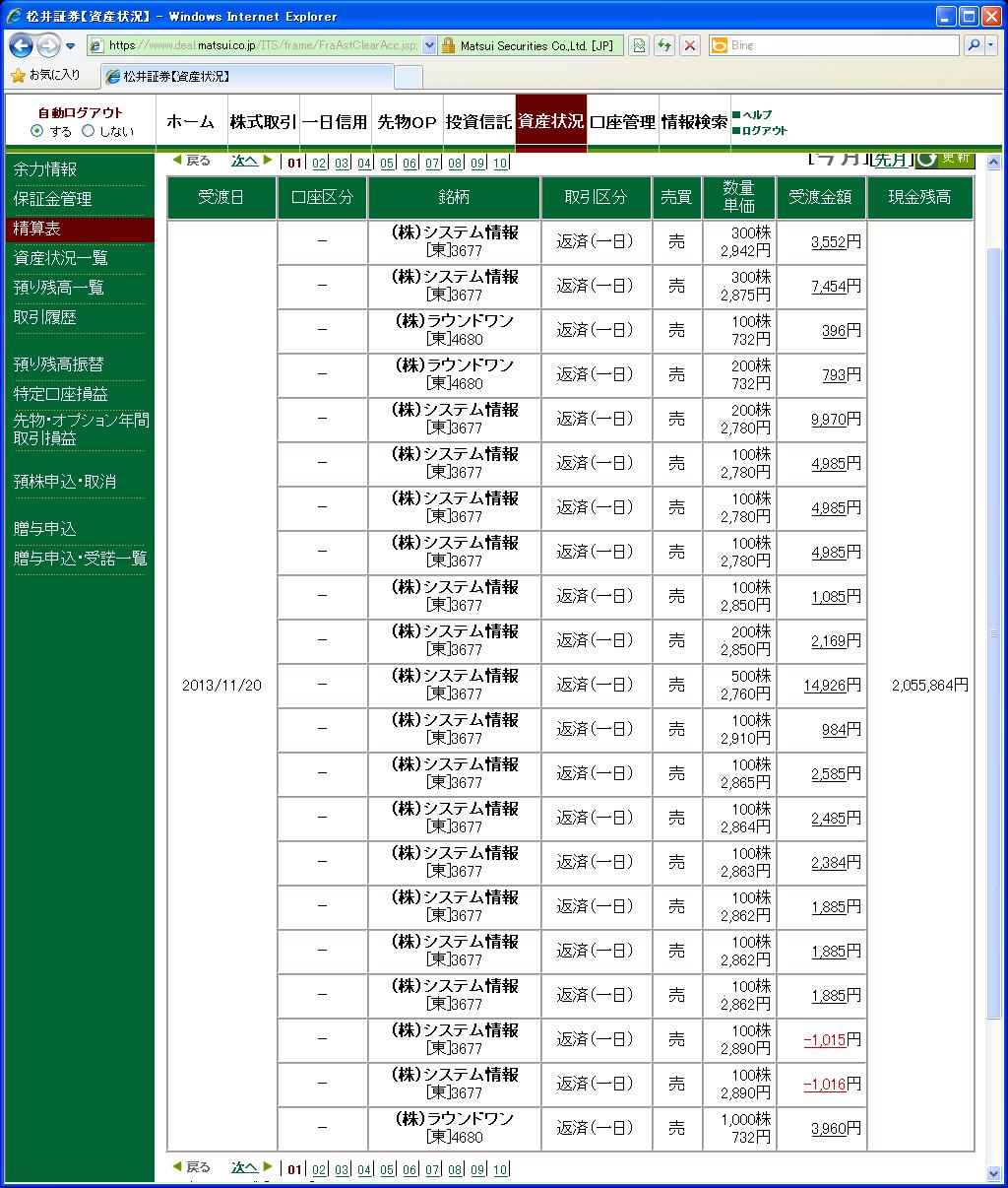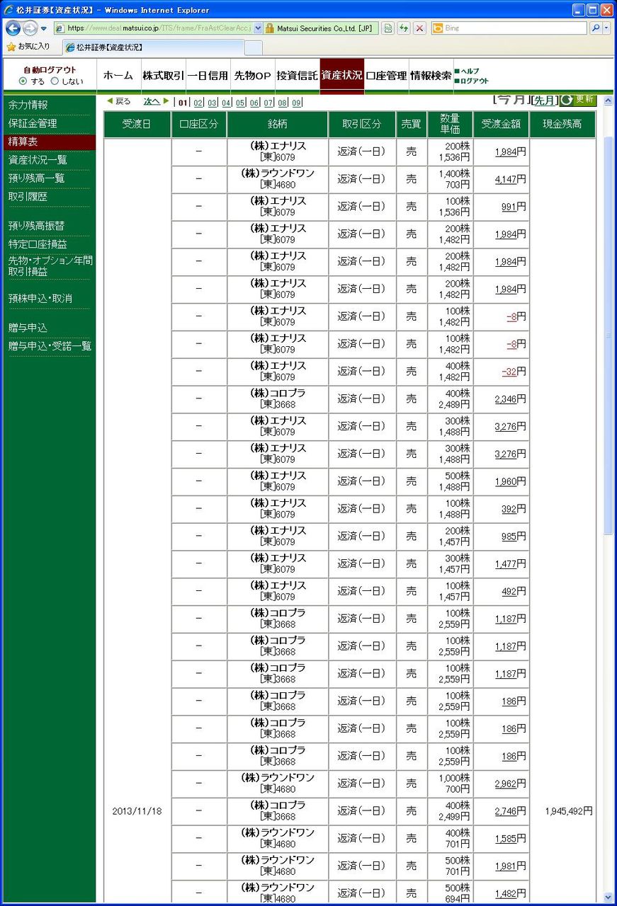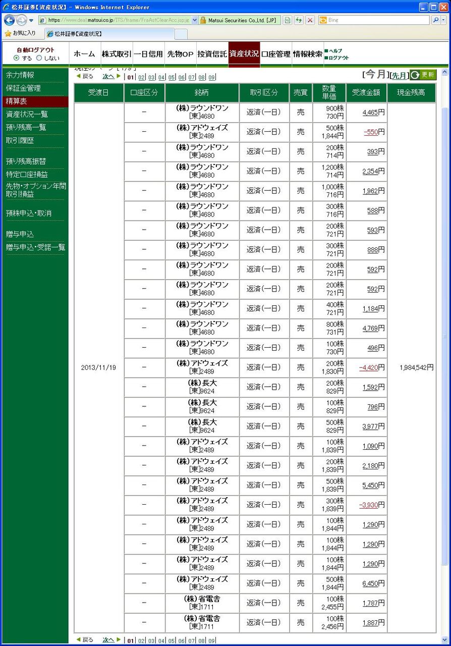 画像は松井証券、本日の清算表の一部です。(本日分全取引の2分の1程度、口座残高の分かる部分をアップしています、日付は受け渡し日で入っています)