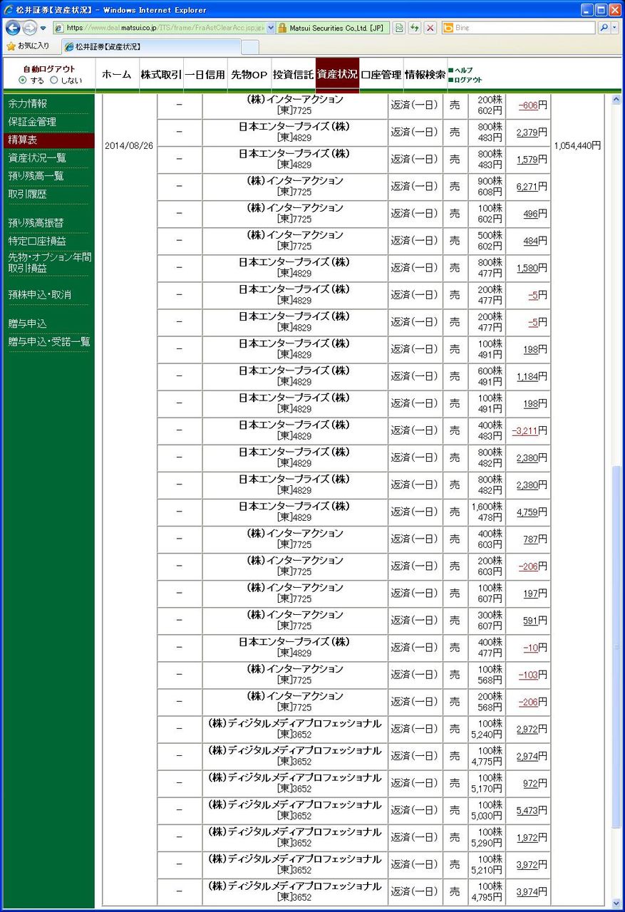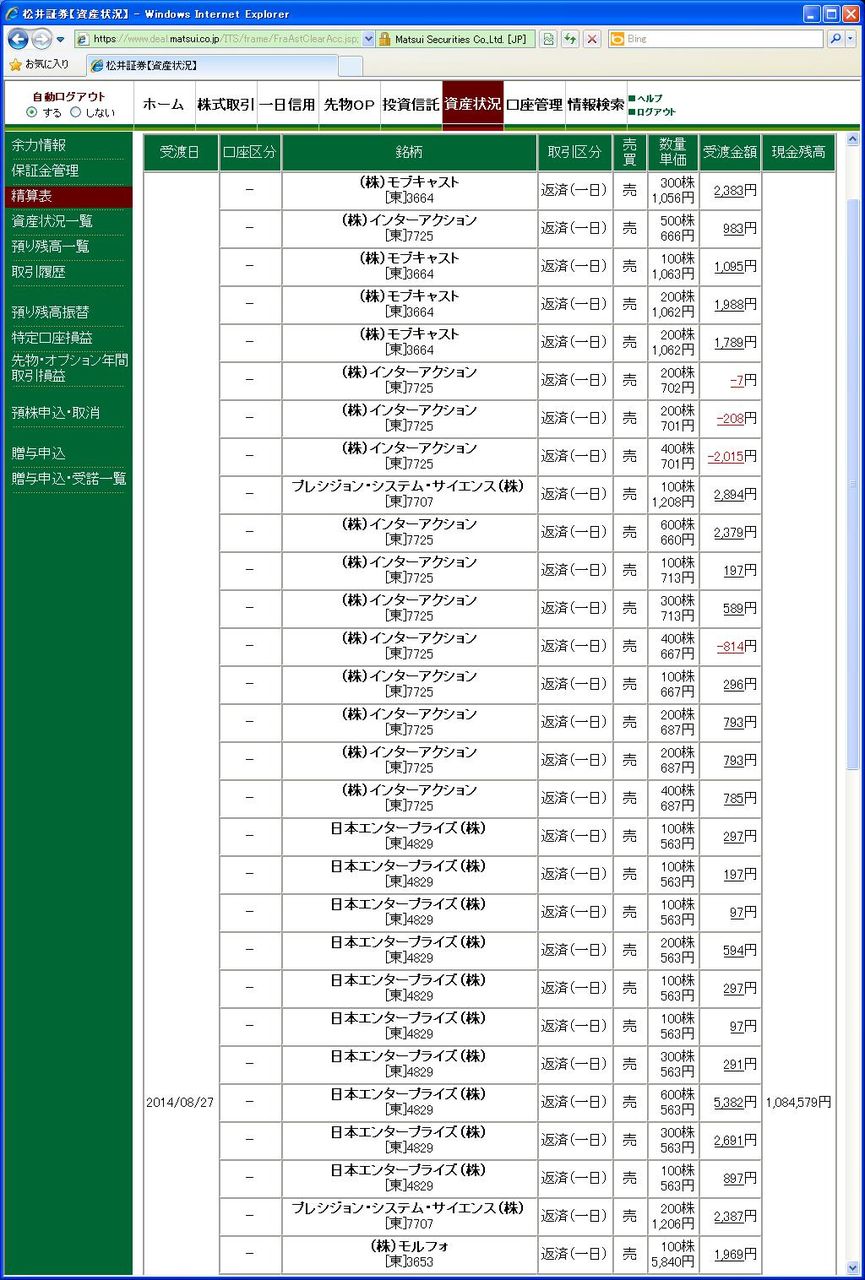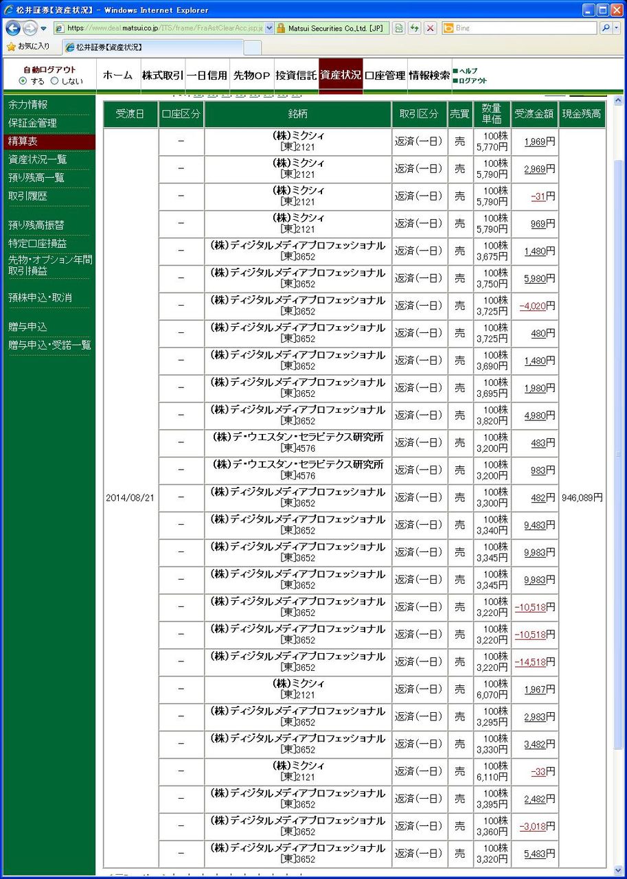 画像は松井証券、本日の清算表の一部です。(日付は受け渡し日で入っています)