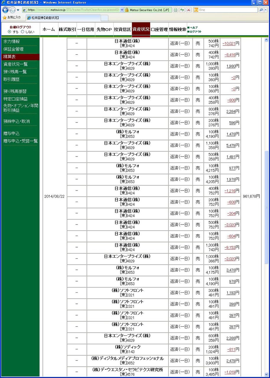 取引したのは3664モブキャスト、7725インターアクション、7707PSS、4829日本エンター、3652DMP。予定があったので9時半少し過ぎたところで取引終了した。