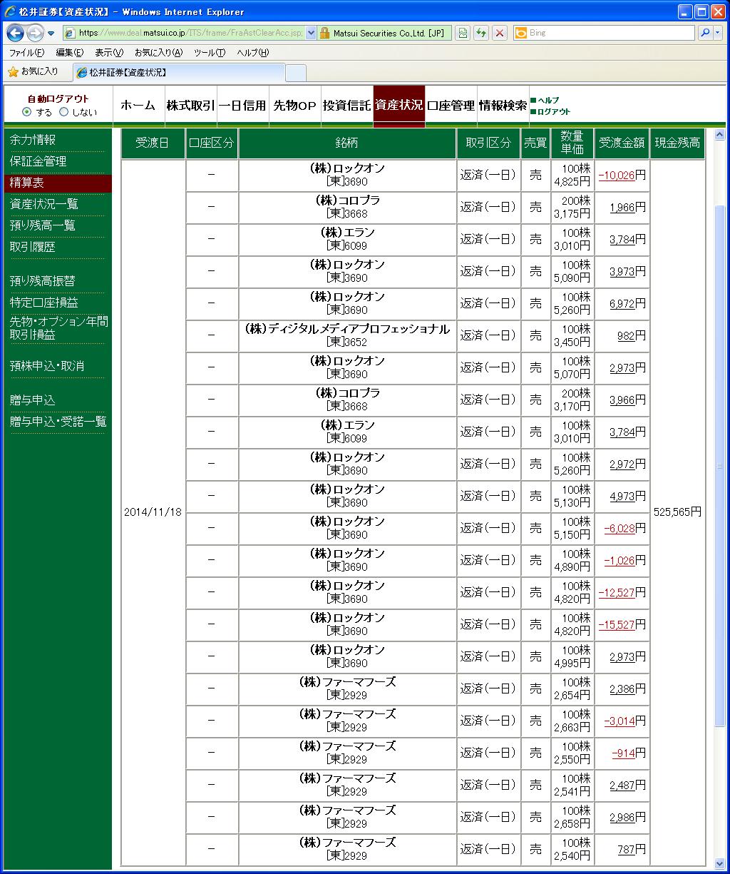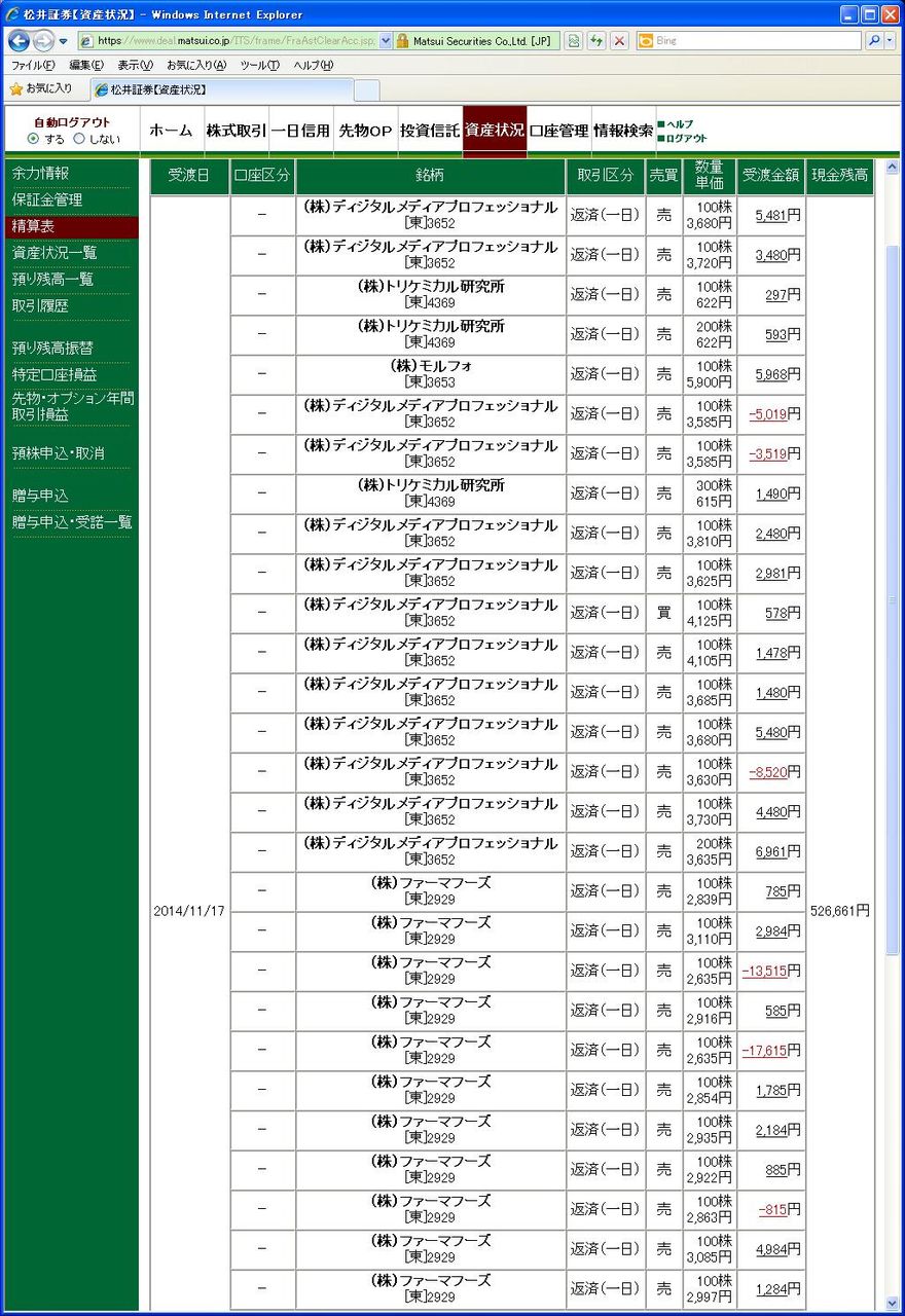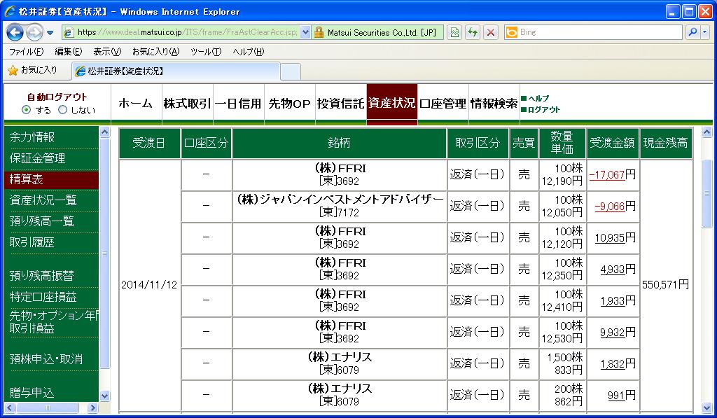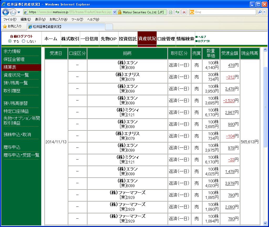 画像は松井証券、本日の清算表の一部です。(日付は受け渡し日で入っています)