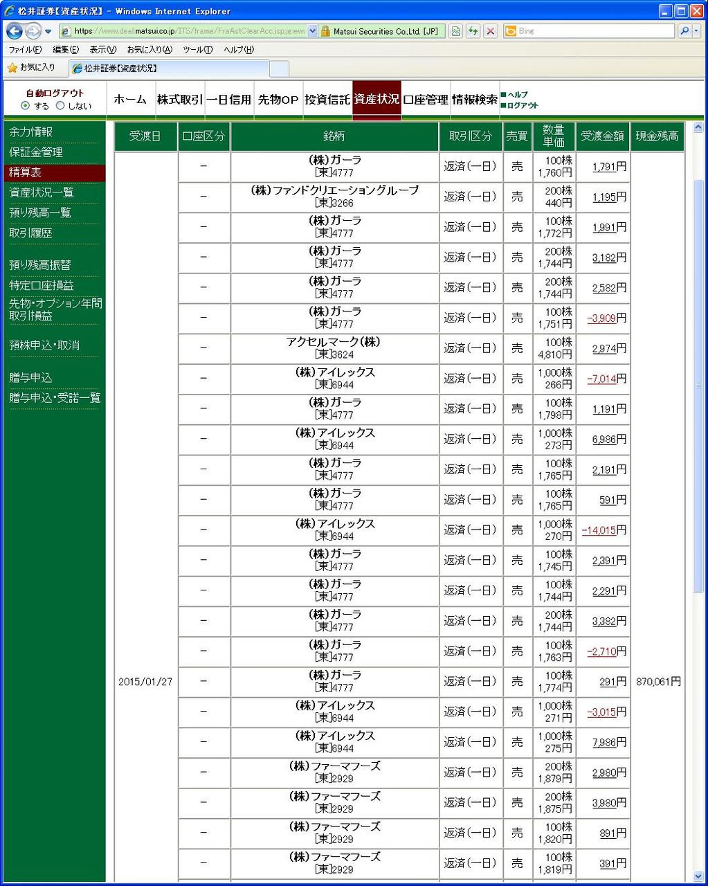 画像は松井証券、本日の清算表の一部です。(日付は受け渡し日で入っています)