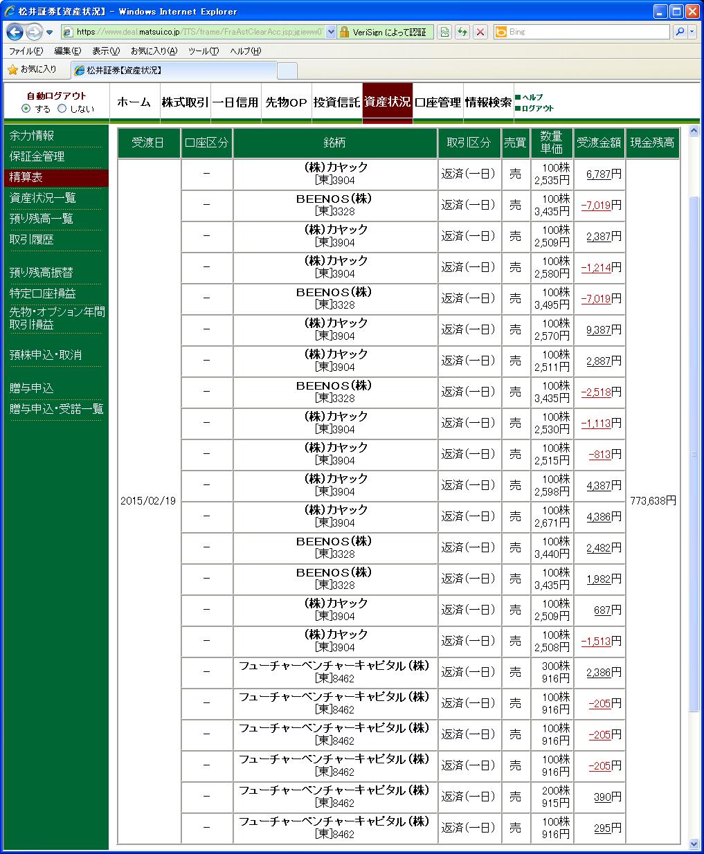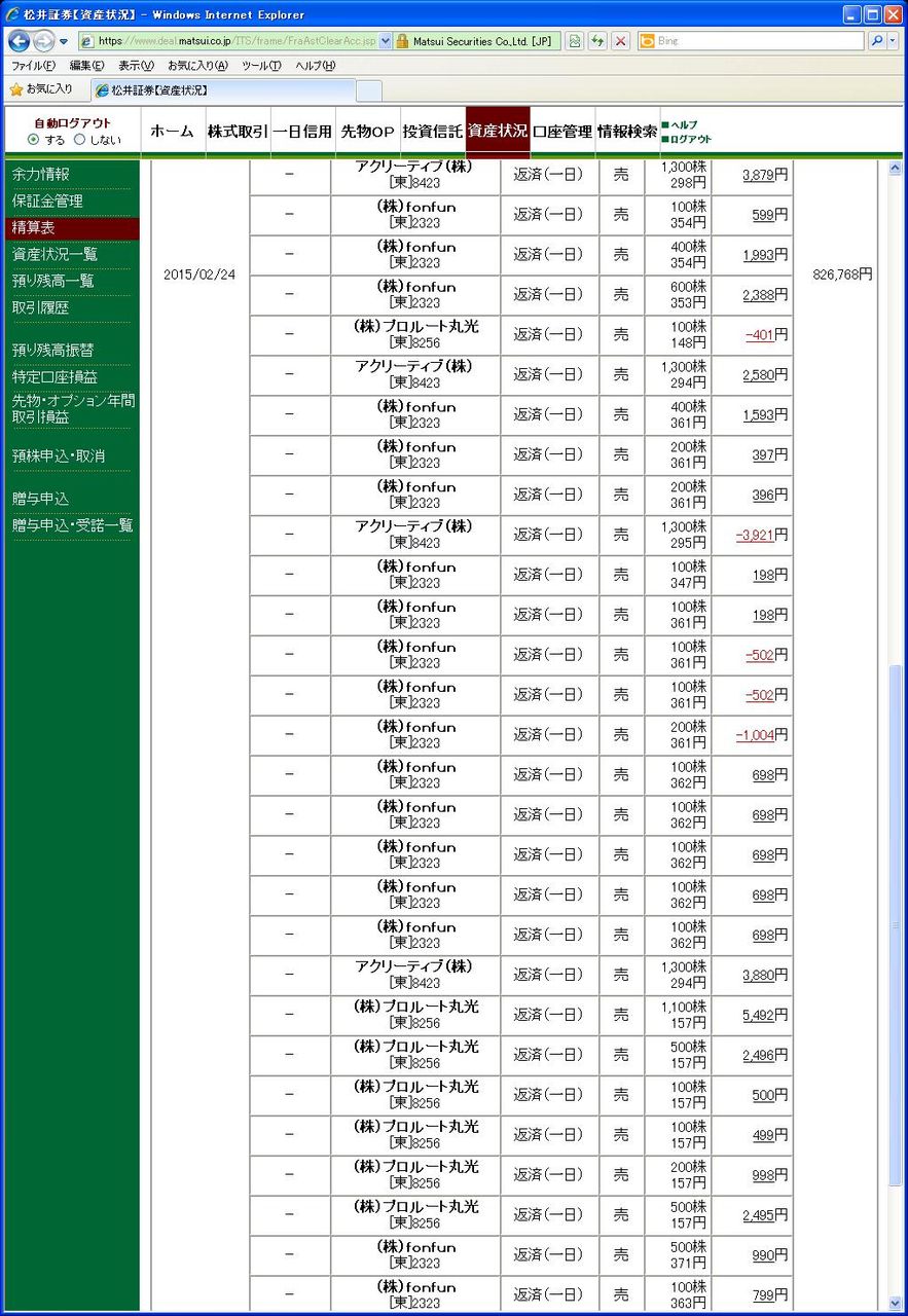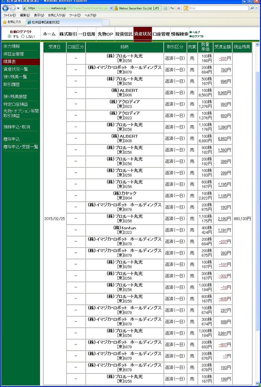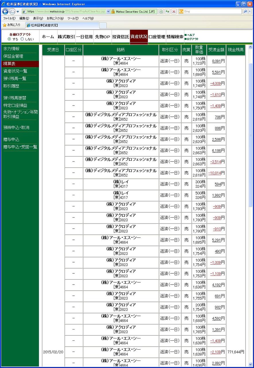 画像は松井証券、本日の清算表の一部です。(日付は受け渡し日で入っています)