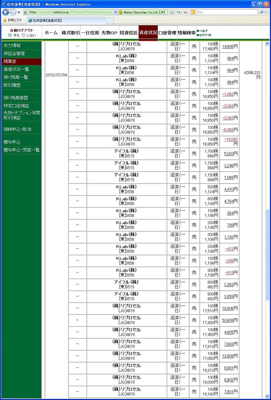 画像は本日の清算表の一部です。(本日分全取引の4分の1程度、口座残高の分かる部分をアップしています、日付は受け渡し日で入っています)