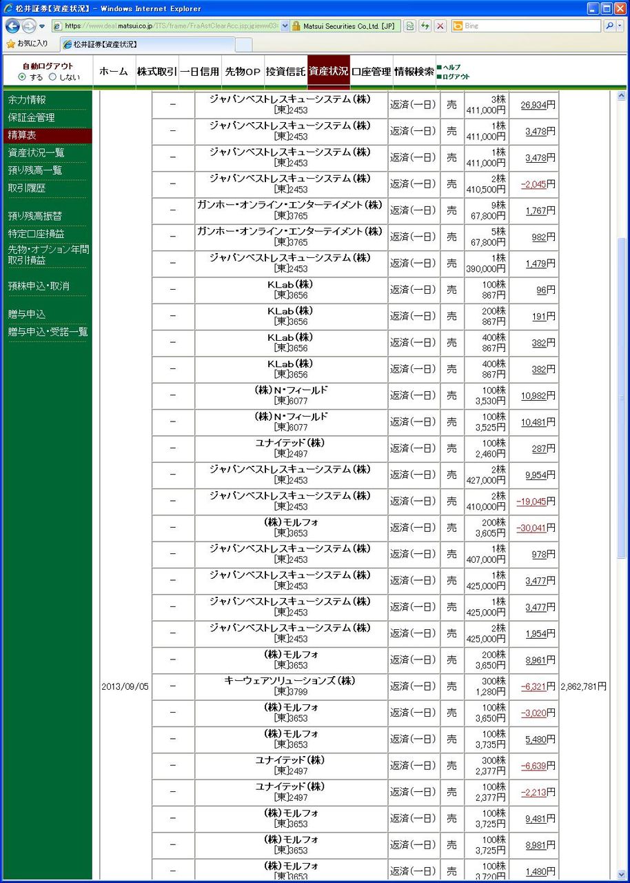 画像は松井証券、本日の清算表の一部です。(本日分全取引の2分の1程度、口座残高の分かる部分をアップしています、日付は受け渡し日で入っています)