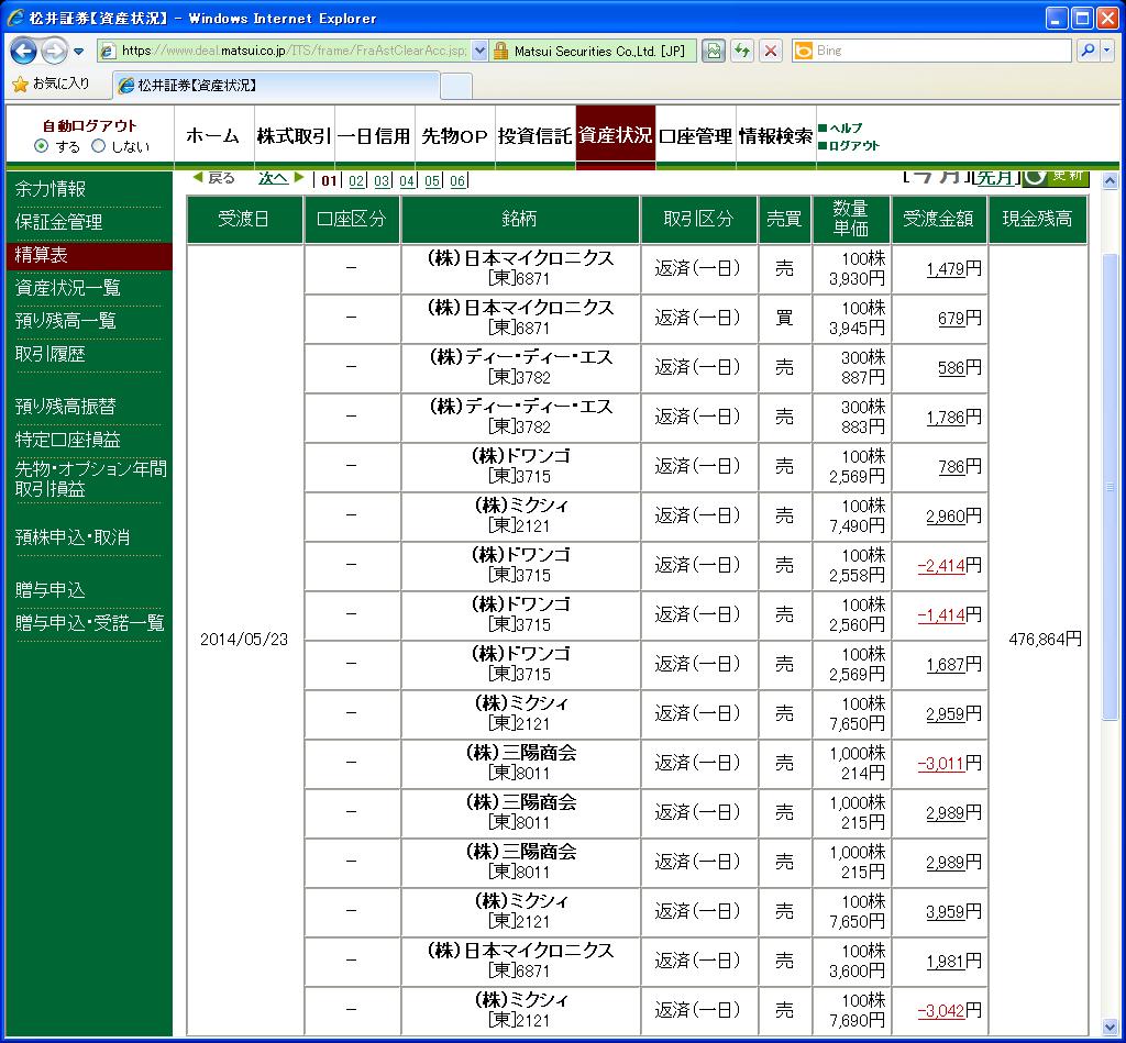 画像は松井証券、本日の清算表です。(日付は受け渡し日で入っています)