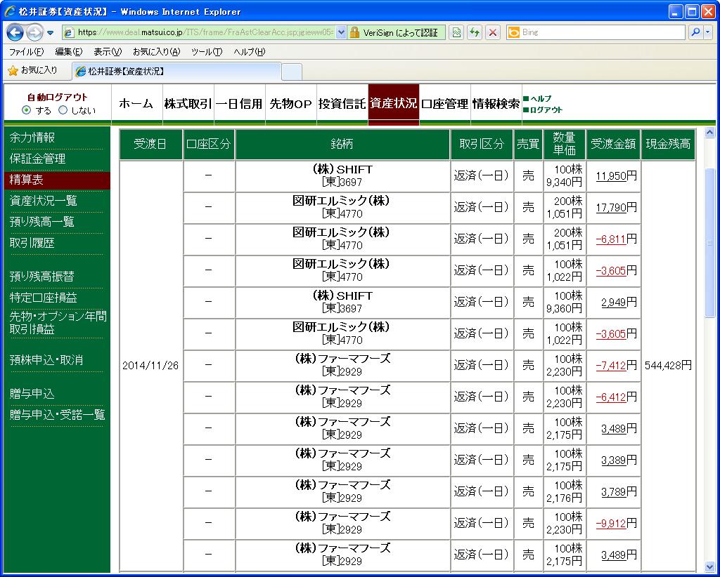 画像は松井証券、本日の清算表です。(日付は受け渡し日で入っています)